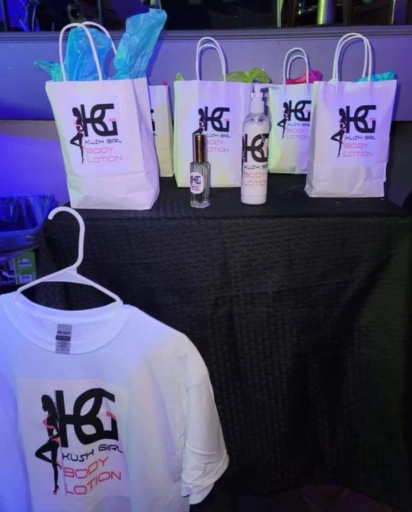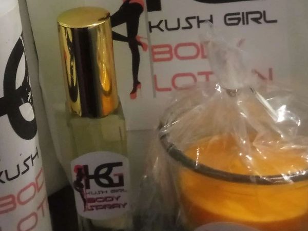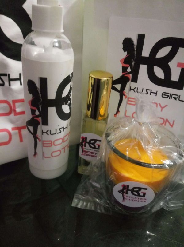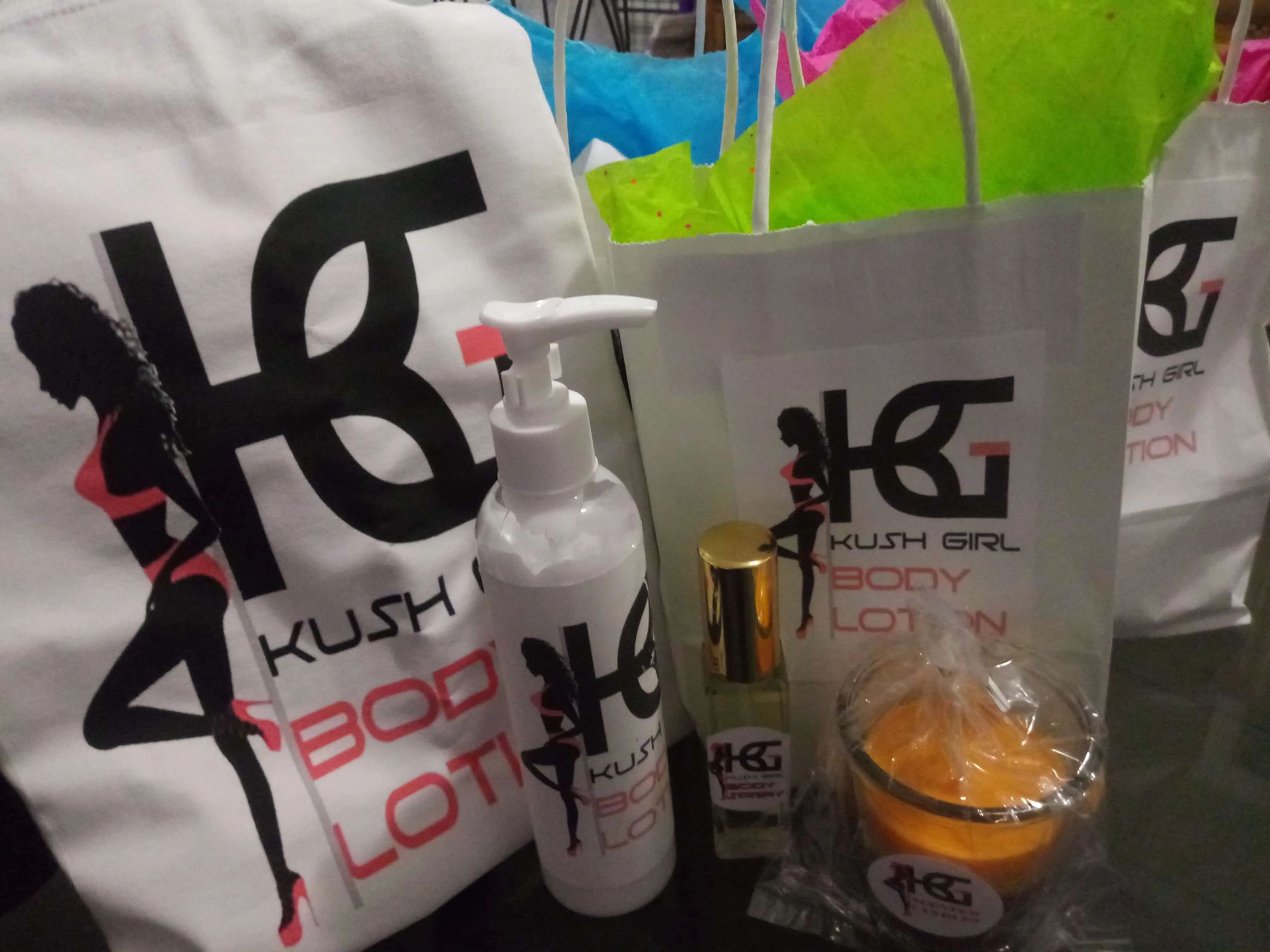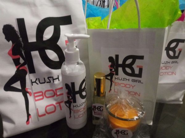1 Tshirt, 1 Bottle of KUSHGIRL Lotion, 1 KUSHGIRL Scented Candle.